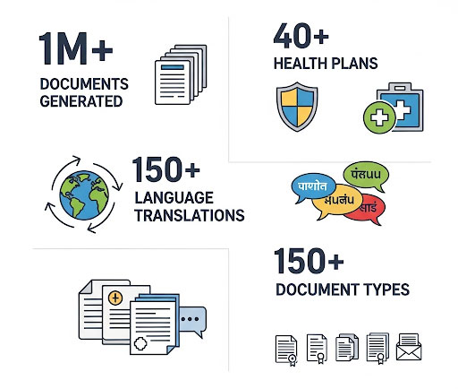 Complete packaged solution — Highly scalable, AI-powered, tech-driven fully managed document generation and language translation workflow for all mandated (ANOC, EOC, SB, SBC, etc.) and non-mandated materials (Benefit Highlights, Rider Booklets, etc.) for all Lines of Business, enabling business process automation and significant cost takeout.